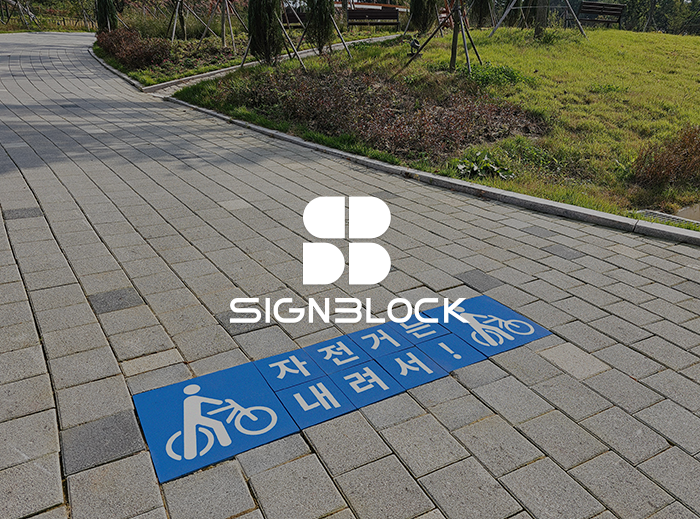 공원 입구 "자전거는 내려서" 바닥 안내표시 ..